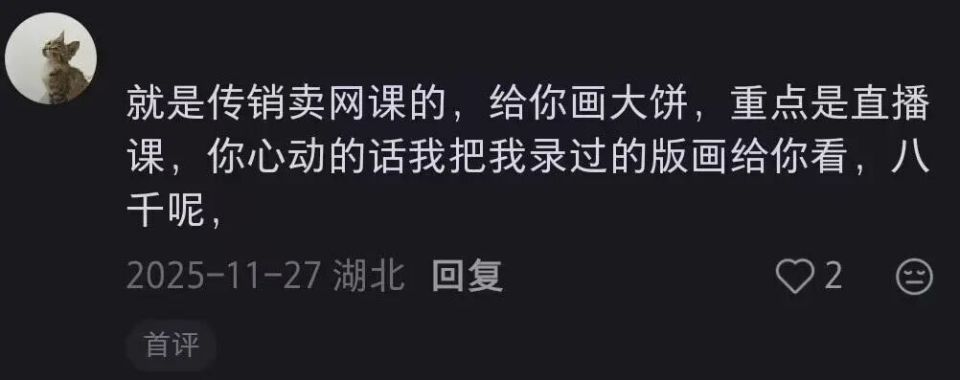 OCR:IMG:就是传销卖网课的,给你画大饼,重点是直播 课,你心动的话我把我录过的版画给你看,八 千呢, 2025-11-27湖北 回复 首评