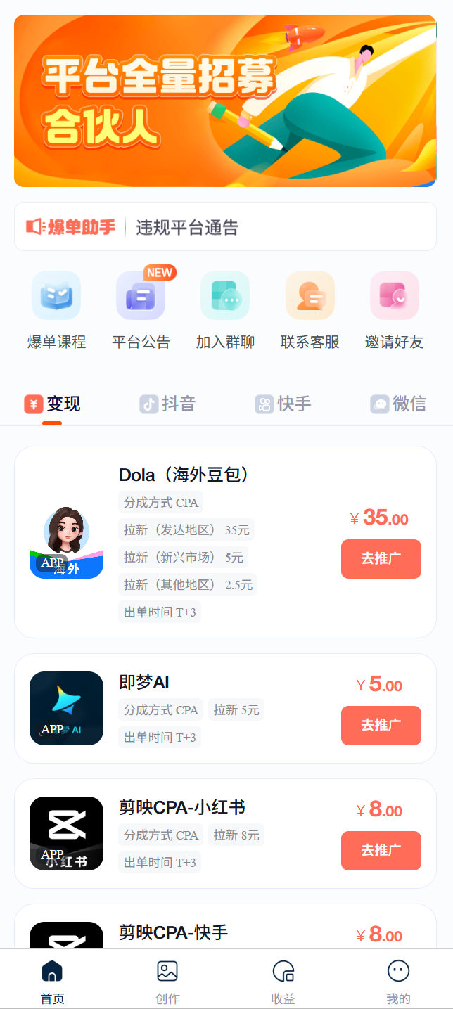 OCR:IMG:平台全量招募 合伙人 口爆单助手 违规平台通告 NEW 爆单课程 平台公告 加入群聊 联系客服 邀请好友 变现 小抖音 ¥ 8快手 微信 Dola(海外豆包) 分成方式CPA ¥35.00 拉新(发达地区) 35元 AP外 拉新(新兴市场) 5元 去推广 拉新(其他地区)2.5元 出单时间T+3 即梦AI ¥5.00 分成方式CPA 拉新5元 去推广 APPAI 出单时间T+3 剪映CPA-小红书 ¥8.00 & 分成方式CPA 拉新8元 AR红书 去推广 出单时间T+3 剪映CPA-快手 ¥8.00 8 首页 创作 收益 我的