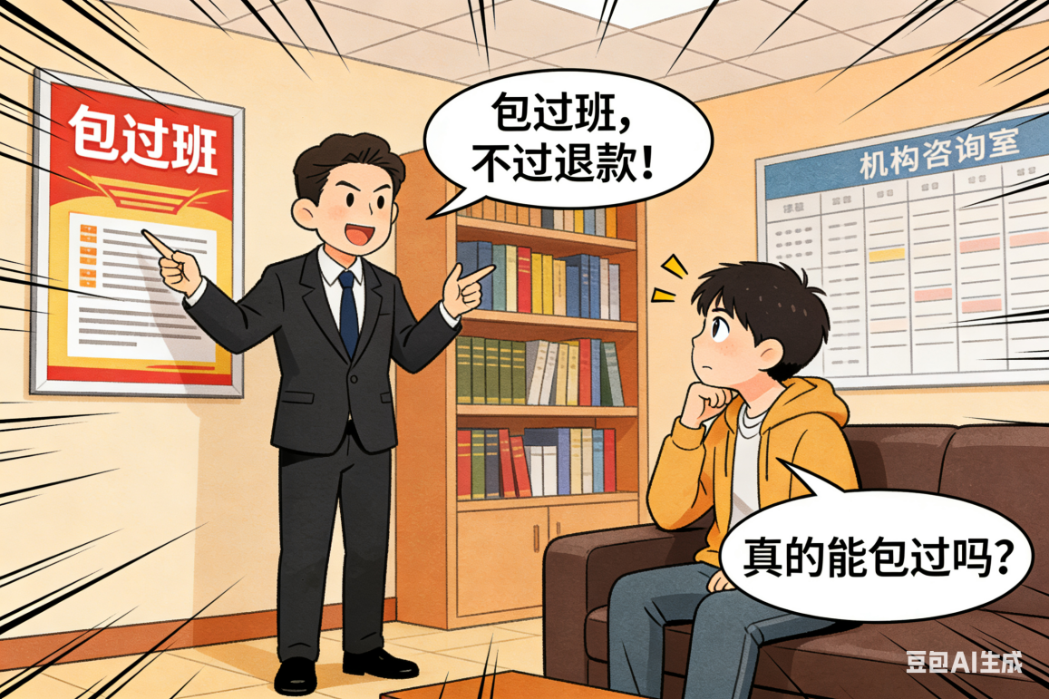 (图片由AI生成)然而,当记者要求查看协议样本时发现,所谓的“包过”暗藏玄机。协议确实写明“未被一志愿录取退费”,但后面的细则却附带了一系列苛刻条件,如:学员需保证全勤(出勤率不低于90%)、完成所有课后作业、参加至少3次模考并达到一定分数等。曾经报名类似班级的考生小孙告诉记者,他当时被“不过退费”吸引,报名了一个15000元的班次,机构承诺听课率达90%可返现20%。虽然他最后拿到了返现,但专业课辅导的课时和质量却令他大失所望——只有50课时,完全无法满足他的学习需求。更深的猫腻在于所谓的“保证金”和概念置换。记者调查发现,部分机构在宣传“包过”时,与消费者玩起了文字游戏。比如,记者探访的这家机构,所谓的“退费”,退的并不是全部费用。据该机构老师透露:“费用包含两部分,一部分是课时费和资料费,大概8000元,这部分是消耗品,不退;剩下的两万是‘学习保证金’,如果没考上,扣掉已上课时费,保证金可以退。”这意味着,即便触发退费条件,考生能拿回的也并非全部学费。这种将学费拆分为“消耗品”与“保证金”的做法,实质上是让机构在任何情况下都稳赚不赔。四川明炬律师事务所律师邢连超分析指出,“包过”承诺本身涉嫌违反广告法。该法明确指出,教育、培训广告不得对升学、通过考试等作出明示或暗示的保证性承诺。设置苛刻条件、拆分费用,实质上是利用信息不对称加重消费者责任。四川民科律师事务所高级合伙人、瀚法无渊律师团队负责人、律师陈维维进一步解释,此类“包过”广告因违法而可能涉嫌无效。考生可依据广告法向市场监管部门举报,虽不能直接获得赔偿,但可通过行政压力促使机构协商退费。相关投诉平台上,类似投诉比比皆是。有考生反映,“不过退费”在操作中被机构以“专业课分数不达标属个人能力问题”“出勤率未达标”等理由拒赔,甚至拖延退款长达半年。这场“包过”的赌局,无论输赢,机构似乎都立于不败之地。“学长学姐”的江湖私域流量下的维权迷局与机构动辄上万的“协议班”相比,隐藏在社交媒体里的“学长学姐”辅导,因其性价比高、直系针对性强的特点,成为不少跨考考生的首选。“我报的是直系学姐的小机构,主体课程都由一位学姐上,这相较于大机构来说更稳妥一些。”艺术学考研学员小谢告诉记者。这种模式通常价格更低,且因为辅导者刚经历过考试,对考点和导师方向更为敏感,能够提供精准的信息差,这是大机构标准化教学所缺少的优势。然而,这种建立在口头信任上的私域交易,正成为侵权的高发地带。四川成都的考生刘念(化名)就遭遇了一场“噩梦”。她在社交平台上看到一名自称是目标院校在读学姐发布的招生信息,对方宣称“免费跟学一个月”,单科仅需2300元,不满意可退款。交钱之后,刘念发现所谓的课程全是两年前的录播课,质量堪忧。当她提出退款时,对方扣除400元“服务费”后,直接将她拉黑。后来刘念才发现,这个人根本不是该校的学生,只是盗用了别人的经验帖进行虚假宣传。记者调查发现,此类“学长学姐辅导”模式呈现“三无”特征:无正规合同、无资质审核、无对公账户。双方的约定往往仅停留在微信聊天记录里,一旦出现纠纷,考生连起诉对象是谁都搞不清楚。
