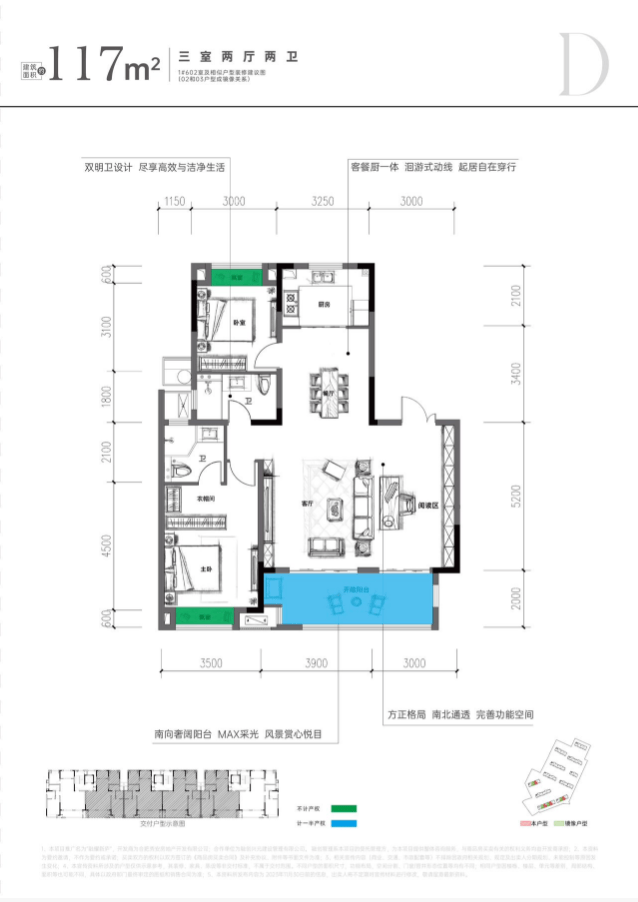 OCR:IMG:117m2 三室两厅两卫 10/02及位户) 双明卫设计尽享高效与活净生活 客餐厨一体泪游式动线起居自在穿行 3250 5000 90 3000 方正格局南北通透完善功能空间 南向奢阔阳台MAX采光风景赏心悦目