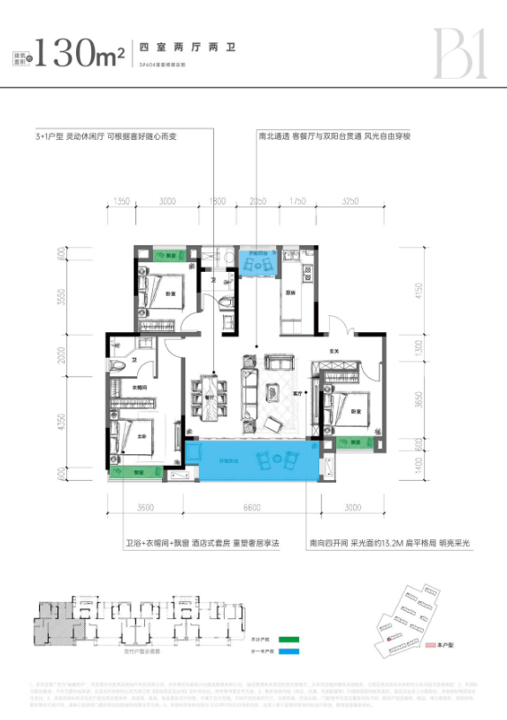 OCR:IMG:B1 130m2 四室两厅两卫 604建 3+1户型灵动休闲厅可根据喜好随心而变 南北通透客餐厅与双阳台贯通风光自由穿换 卫浴+衣帽间+飘窗酒店式套房重塑奢居享法 南向四开间采光面约13.2M扁平格局明亮采光 1r11