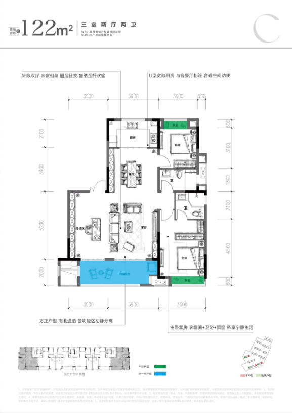 OCR:IMG:122m2 三室两厅两卫 101018及量出户管美是建文图 轩败双厅亲发相聚图层社交盛纳全龄欢愉 U型宽厨房与客餐厅相连合理空间动线 增 方正户型南北通透各功能区动静分减 主卧套房衣帽间+卫浴+飘窗私享宁静生活
